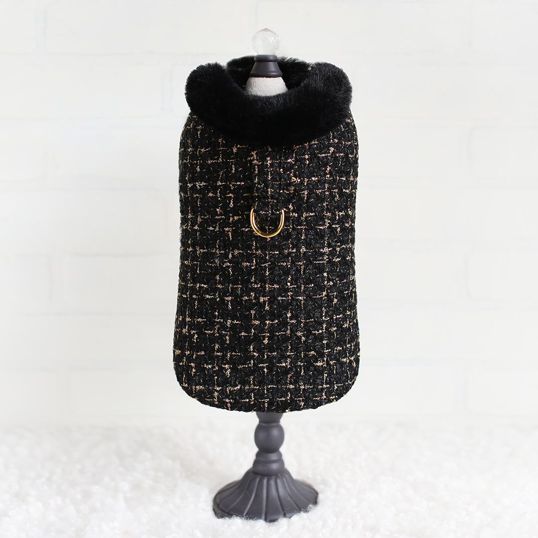 Your precious pooch will look regal in the Chantel Tweed Dog Coat by Hello Doggie. Our new coat collection was released just in time for the fall/winter season. When designing this coat we had the pooch in mind, our fur babies get cold too while they're out on the town for holiday shopping or a walk in the park. The coats are made from a beautiful soft tweed fabric and are lined with faux fur for a timeless design  and to keep out that extra chill. These coats are perfect to pair up with your favorite Hello Doggie sweater, featuring adjustable velcro straps for a perfect fit when adding layers. It is easy to care for, delicate wash with no softener or bleach and air dry. Our coats are fashionable and most importantly comfortable to wear. Each Coat has a matching harness, sold separately. Limited Edition MSRP $84.00 * Coats are handmade sizes may vary slightly. Made in USA.